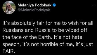 | Es absolutamente justo para mí pedir que todos los rusos y Rusia sean eliminados de la faz de la Tierra. No es solamente discurso de odio. No es discurso de odio, no es horrible para mí. Es simplemente JUSTO. |