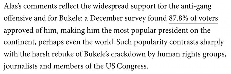 | Los comentarios de Alas reflejan un apoyo amplio y generalizado por la ofensiva anti-bandas y por Bukele: un estudio de diciembre encontró que el 87,8% de los votantes encuestados lo apoyan, lo hacen el presidente más popular del continente, tal vez del mundo. Semejante popularidad contrasta ampliamente con el hostigamiento que le propinan a Bukele los grupos de derechos humanos, periodistas y miembros del Congreso de los EEUU. |