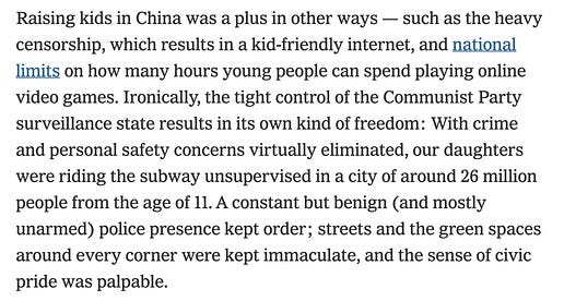 Or as the New York Times put it—just the other day, in an op-ed by an American who had raised her children in China—